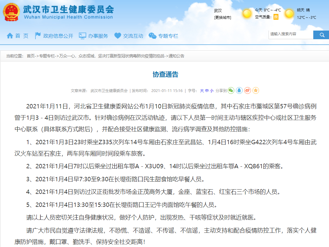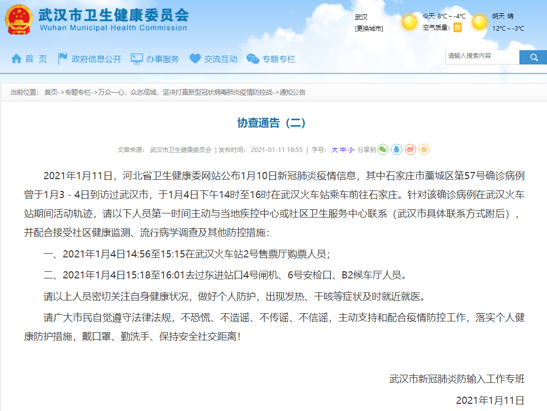 2021年1月11日,河北省卫生健康委网站公布1月10日新冠肺炎疫情信息,其中石家庄市藁城区第57号确诊病例曾于1月3-4日到访过武汉市,于1月4日下午14时至16时在武汉火车站乘车前往石家庄。针对该确诊病例在武汉火车站期间活动轨迹,请以下人员第一时间主动与当地疾控中心或社区卫生服务中心联系(武汉市具体联系方式附后),并配合接受社区健康监测、流行病学调查及其他防控措施: