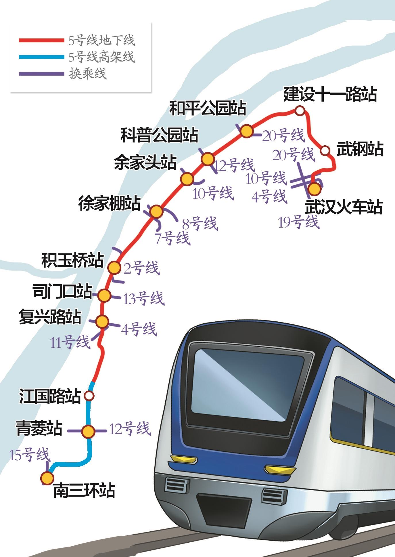 据武汉地铁集团介绍,武汉轨道交通5号线工程是城市轨道交通网络规划中市区骨架线网的重要组成部分,线路全长33.57km,南起南三环,北至武汉火车站,全线共设站25座,采用高架与地下线路相结合的方式敷设,其中高架站6座,地下站19座,换乘站10座,规划建设期为2017-2021年。线路途经烽胜路、白沙洲大道、复兴路、黄鹤楼南路、和平大道 、工人村路、冶金大道、团结大道,连接了青菱白沙居住区、司门口商圈、武昌滨江活动区、徐东商圈、青山滨江商务区、青山循环经济试点区、高铁经济集聚区等诸多城市热点区域。
