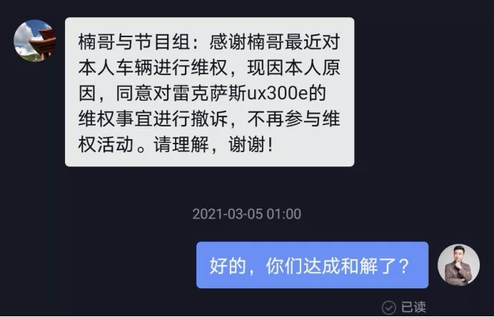 第二天,也就是3月4日,神剧情来了:当晚23点,《我的汽车我做主》节目主播江楠收到深圳车主姚先生的私信:感谢主持人和节目组的付出,同意对UX300e进行撤诉,不再参与维权活动。