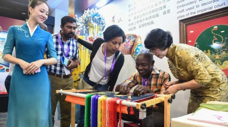 Foreign guests experiencing Han embroidery under the guidance of Wang Ziyi, an inheritor of Han embroidery skills