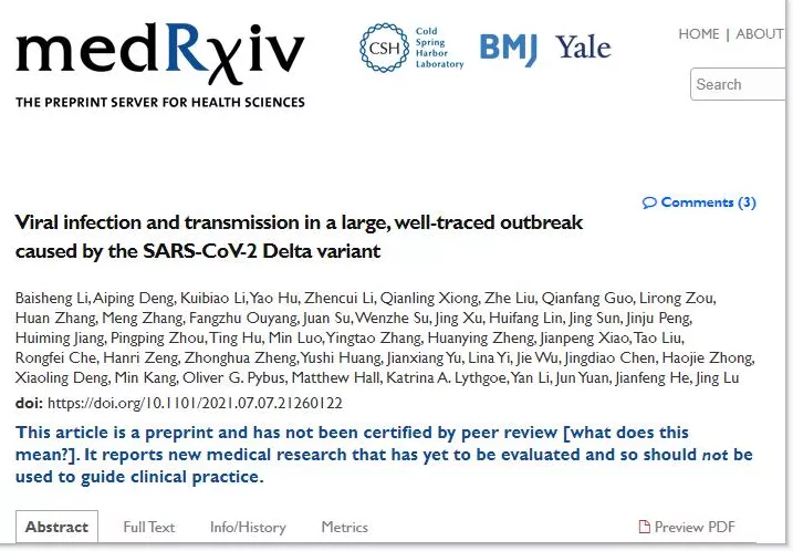 7月12日,中国广东省疾控制中心的一组研究人员在medRxiv预印本平台发布的研究论文指出,德尔塔毒株感染者的呼吸道病毒载量是原始毒株感染者的1260倍。截图自medRxiv