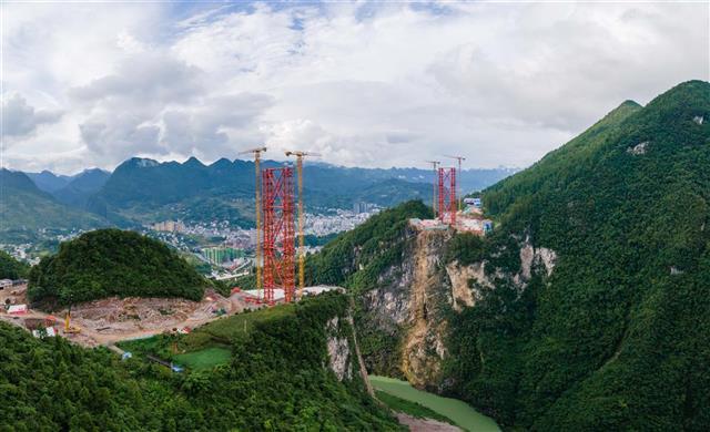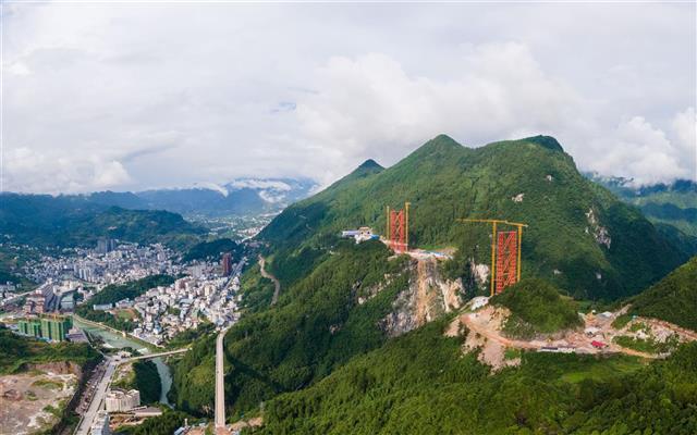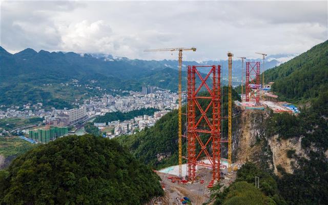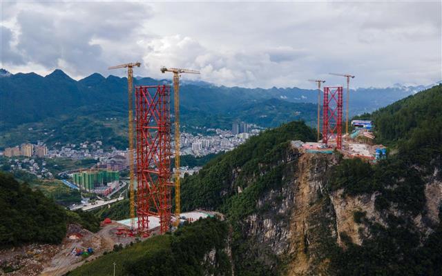 8月16日,宜来高速公路鹤峰东段溇水河特大桥施工现场,两座高120米的扣塔耸立在峡谷之上,工人正在进行铰座、缆塔施工。该大桥是宜来凤高速公路鹤峰东段控制性工程,为钢箱拱桁架桥,主跨310米,横跨溇水河谷,由湖北交投投资建设,中铁大桥局六公司施工。