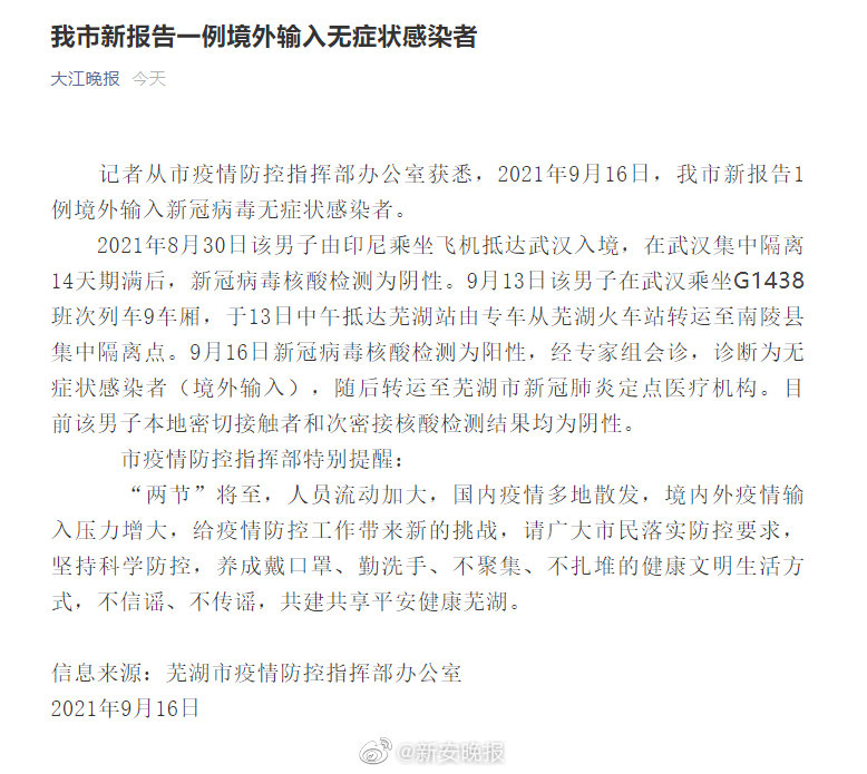 2021年8月30日,该男子由印尼乘坐飞机抵达武汉入境,在武汉集中隔离14天期满后,新冠病毒核酸检测为阴性。9月13日该男子在武汉乘坐G1438班次列车9车厢,于13日中午抵达芜湖站由专车从芜湖火车站转运至南陵县集中隔离点。9月16日新冠病毒核酸检测为阳性,经专家组会诊,诊断为无症状感染者(境外输入),随后转运至芜湖市新冠肺炎定点医疗机构。目前该男子本地密切接触者和次密接核酸检测结果均为阴性。