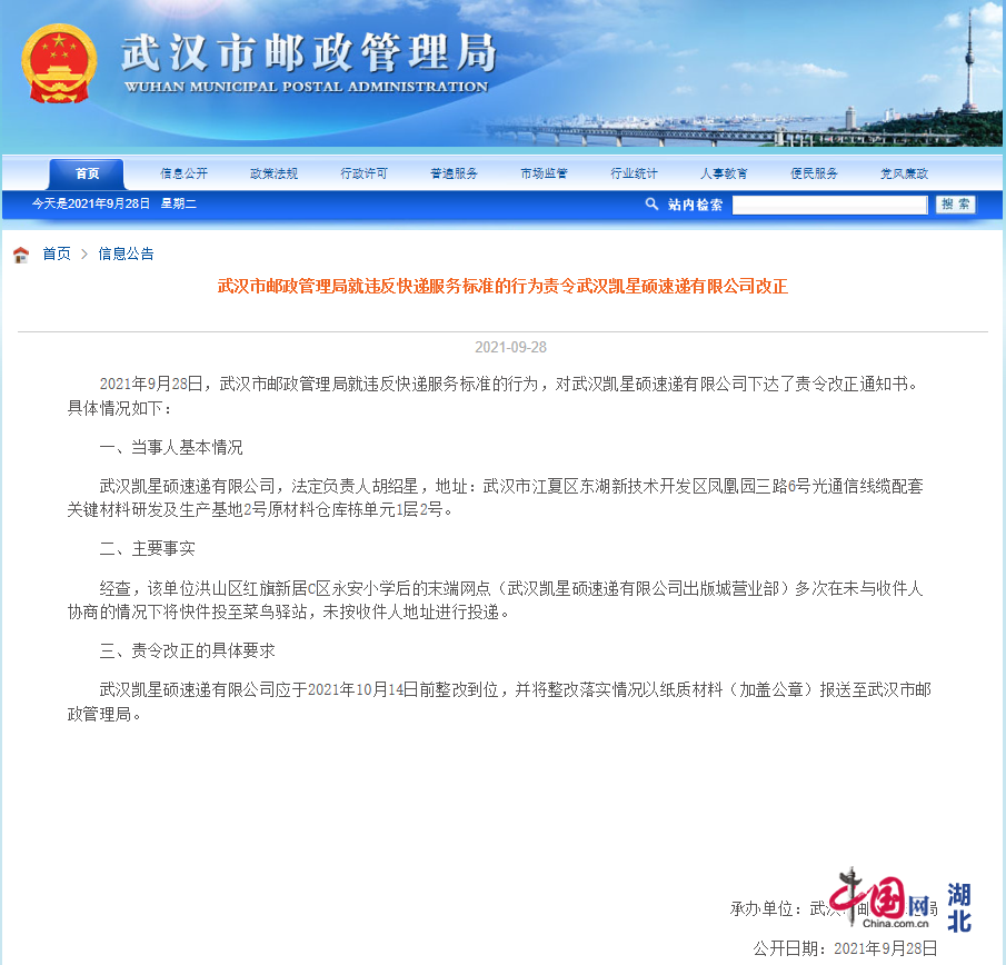 2021年9月28日,武汉市邮政管理局就违反快递服务标准的行为,对武汉凯星硕速递有限公司下达了责令改正通知书。具体情况如下: