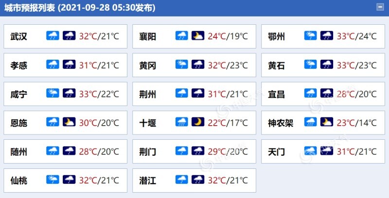 今明两天(9月28至29日),湖北自西向东出现降水过程,局地还将有暴雨上线,并伴有强对流天气。提醒公众及时关注天气预报、预警信息,做好防雨措施。