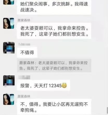 11月12日早上7点多,卢某林在“狮南1网格群(1、2栋)”中说:“小区遛狗不牵狗绳的老太婆,聚集了几个老太婆,每天早上在我上班的路上堵我。今天我已经走过去了,喊我,我今天也没牵狗绳,你来打呀。”
