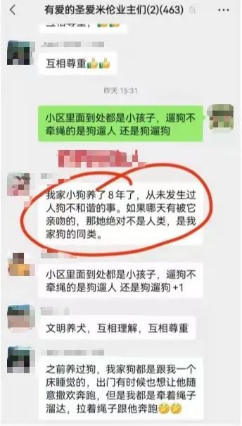 11月12日下午,一位疑似遛狗业主亲属的人进入“有爱的圣爱米伦业主们(2)”群中并表示:“我家小狗养了8年,从未发生过人狗不和谐的事,如果哪天有被它亲吻的,那她绝对不是人类,是我们家狗的同类。”