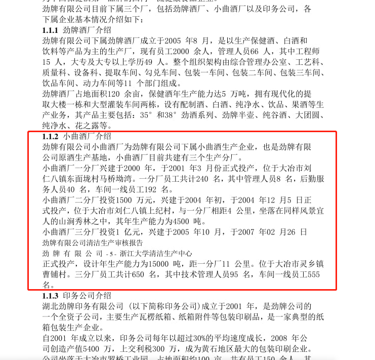 红星资本局了解到,劲牌浙江大学清洁生产中心2009年12月发布的《劲牌有限公司清洁生产审核报告》显示,在2000年至2005年期间,劲牌公司分别在大冶市(注:1995年被黄山市代管)建立了三个小曲酒厂。其中,一分厂兴建于2000年,2001年3月投产,位于大冶市刘仁八镇东面陇村马桥坳湾,员工有240人;二分厂投资1500万,兴建于2004年初,2004年12月投产,位于上纪村,坐落在风景宜人的山涧秀林之中,年生产能力4500吨;三分厂投资1亿元,兴建于2005年12月,2007年2月投用,设计年生产能力15000吨。