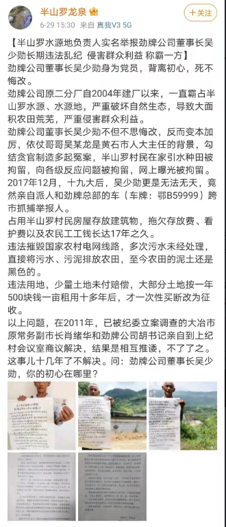 湖北一位村民罗兆义向红星资本局爆料称,劲牌有限公司(以下简称“劲牌”)在当地的酒厂“破坏自然生态”。同时,他还给红星资本局发来了他的实名举报资料。