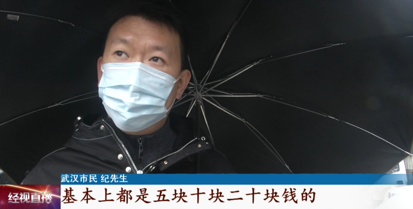 武汉市民 纪先生:基本上都是五块、十块、二十块钱的,有少量五十、一百的,一百的可能还不足一两千块钱。