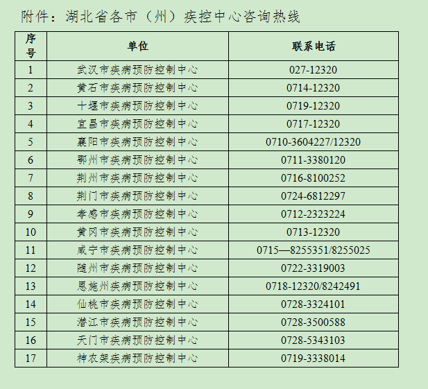 一、2022年1月19日(含)以来有浙江省杭州市拱墅区半山街道和上塘街道、1月22日(含)以来有杭州市富阳区洞桥镇、1月11日(含)以来有黑龙江省牡丹江市东宁市旅居史的来鄂返鄂人员在做好个人防护的情况下,请主动向当地社区进行健康申报,并配合当地疫情防控指挥部的所有防控措施。如有疑问或转码有误可拨打我省各级疾控中心咨询热线(号码附后)。