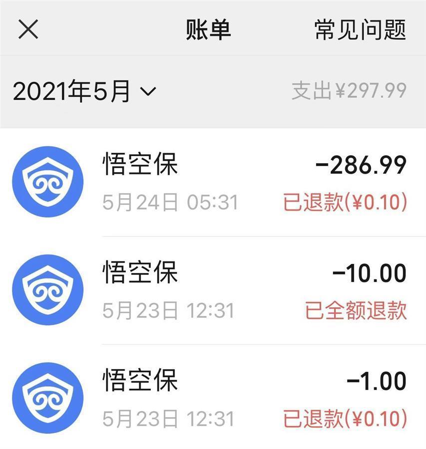 2月15日,叶先生向极目新闻记者展示了其微信扣款记录。记录显示,5月23日12时31分共有两笔悟空保扣款,金额分别为1元和10元。其中,1元退款0.10元,10元已全额退款。5月24日5时31分又有一笔286.99元扣款。此后,每月25日左右都有一笔286.99元的扣款记录。商品名称就是“悟空全民医保康享版”,商户名称为安润国际保险经纪(北京)有限公司。