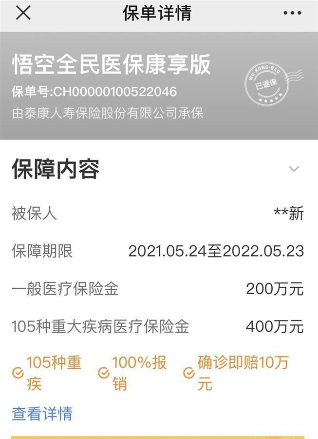 极目新闻记者留意到,叶先生“购买”的这份“悟空全民医保康享版”保险,在泰康保险的名称为“泰康瑞医保保险产品计划”,保单号是一样的。截至2022年2月,叶先生共缴纳了9个月保费,实付保费2288.92元。2月15日,叶先生申请退保,系统只退回了53.97元。工作人员称,这个保险是消费型保险,投保人如果退保,只会按照当月未保障时间退回相应保费。