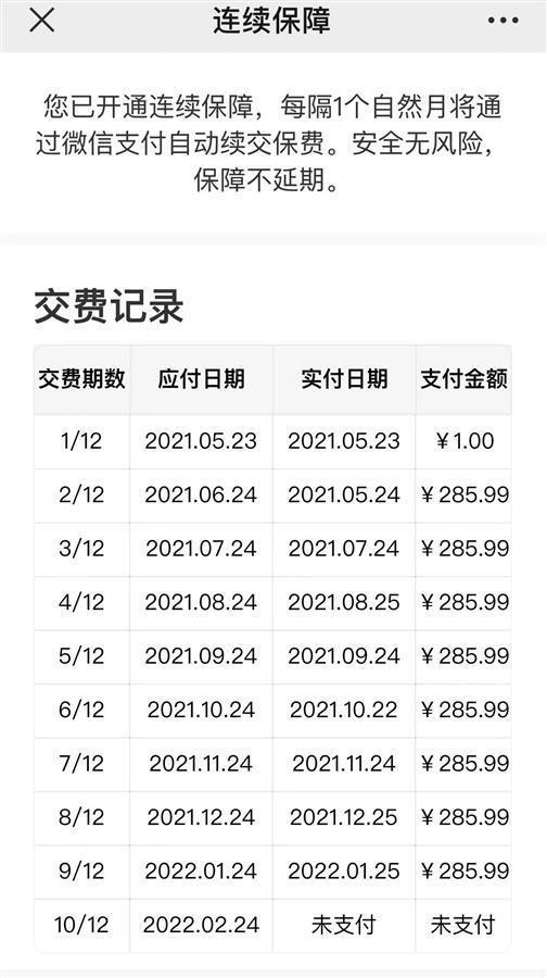 从未购买过相关保险,微信上却每月被划扣近300元保费。自2021年5月开始,已被连续划扣了9个月,合计2000余元。