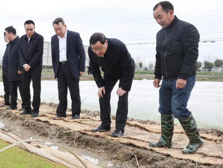 当前正值早稻播种育秧的关键期。省领导来到佛子山镇瑞丰合作社生产基地,俯身察看育秧出苗情况,了解稻田耕整、沟渠供水等情况。