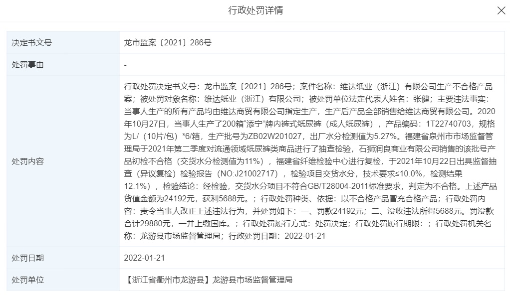 近日记者在天眼查发现,维达纸业(浙江)有限公司因生产的纸尿裤交货水分项目初检复检均不合格,被龙游县市场监督管理局罚款2.42万元、没收违法所得5688元。