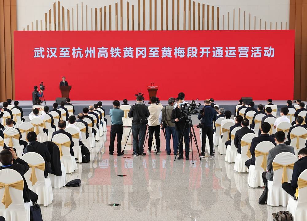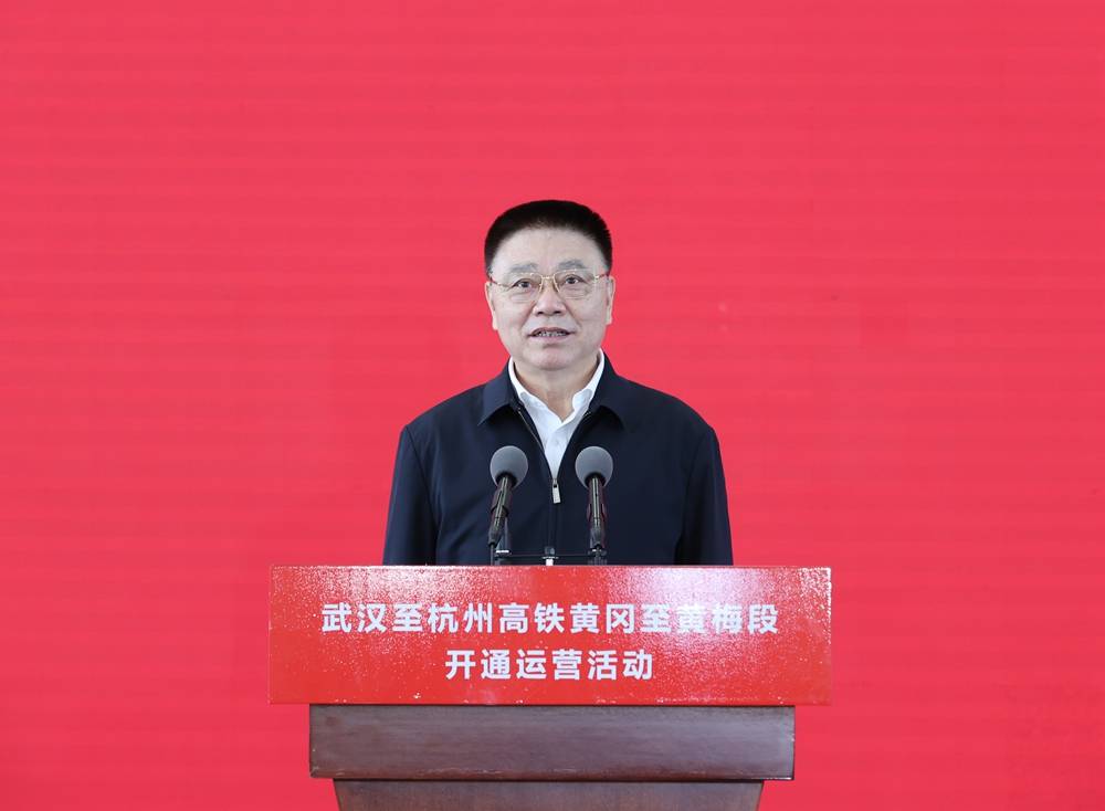 4月22日上午,武汉至杭州高铁黄冈至黄梅段开通运营活动在黄梅县黄梅东站举行。省委书记王蒙徽出席,并宣布黄黄高铁正式开通。省委副书记、省长王忠林,国铁集团副总经理、党组成员王同军致辞。