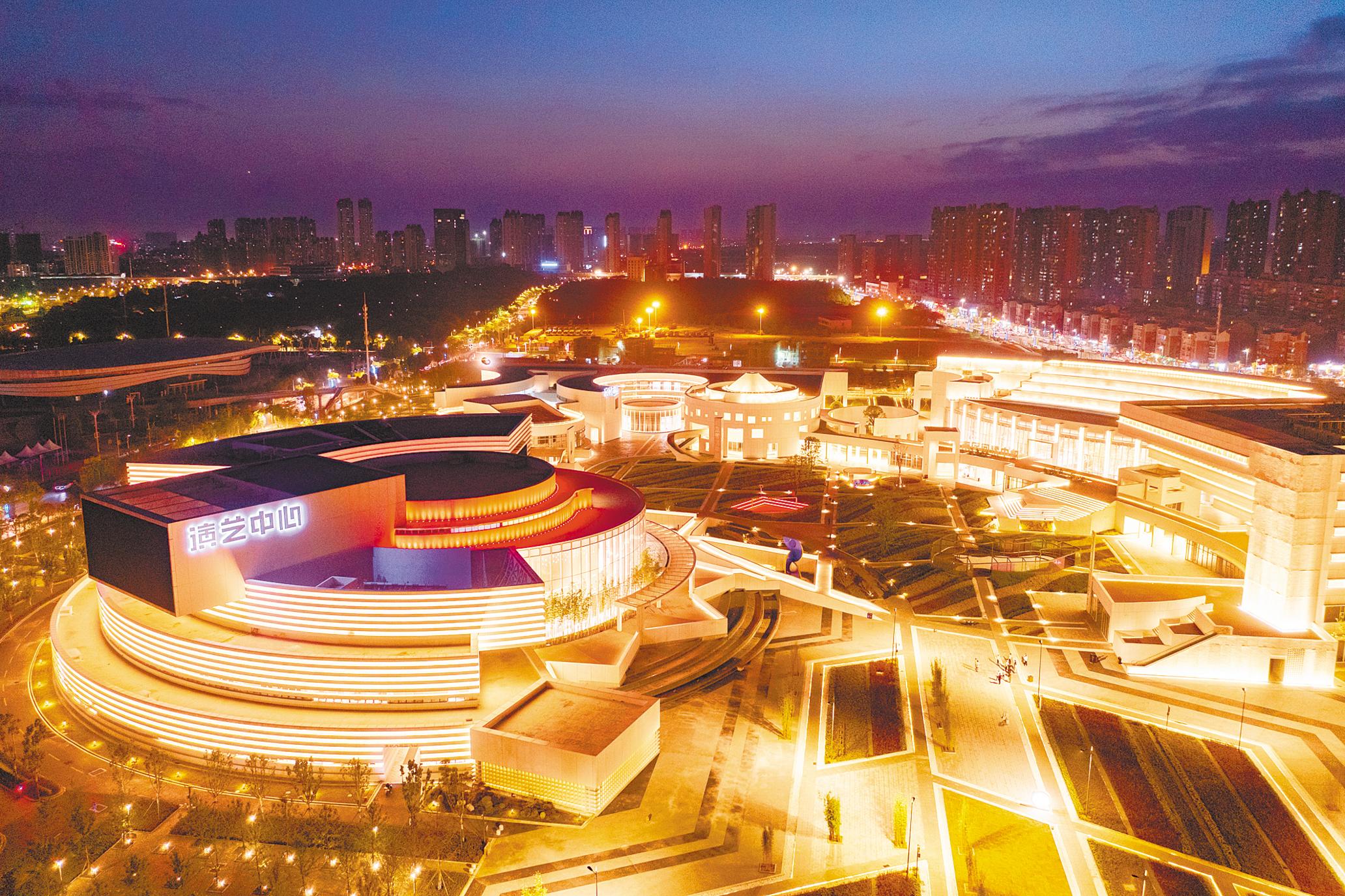 9月6日,空中俯瞰亮灯的武汉市东西湖区文化中心灯光璀璨,流光溢彩。当日,东西湖区文化中心启动外立面灯光调试。据介绍,以“城市之眼、文化之窗”高标准建设打造的东西湖文化中心,是集演艺中心、文化馆、档案服务中心、市民阅读中心、文化创意产业中心、博物馆科技馆等为一体的多场馆建筑群,本月底将与市民见面。