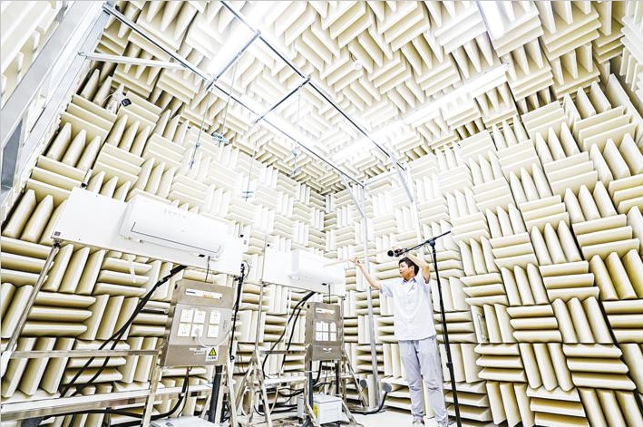 TCL空调武汉智能制造产业园实施严苛的质量标准,图为技术人员在实验室对产品进行噪音测试。 (倪娜 摄)