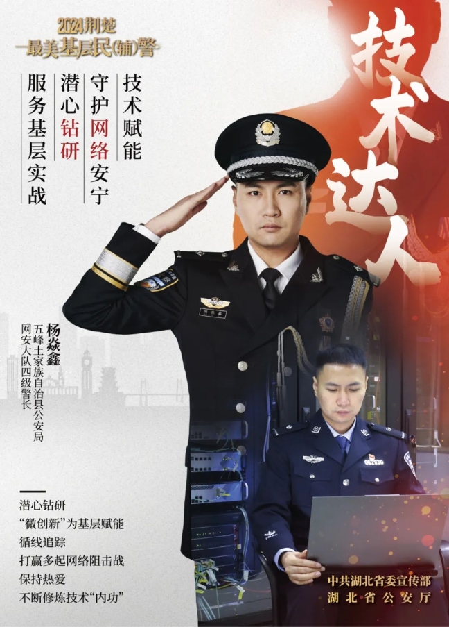 他聚焦基层公安工作,5年内带领团队发明15个技术模型服务基层实战。他多次参加各类实战比武,2023年获得湖北省网安部门举办的业务大比武团体一等奖,还在公安部某专项会战中因成绩突出荣立个人三等功;2024年被省公安厅评为“全省网络攻防标兵”,并荣获宜昌市第三届刑事技术职业技能大赛一等奖。