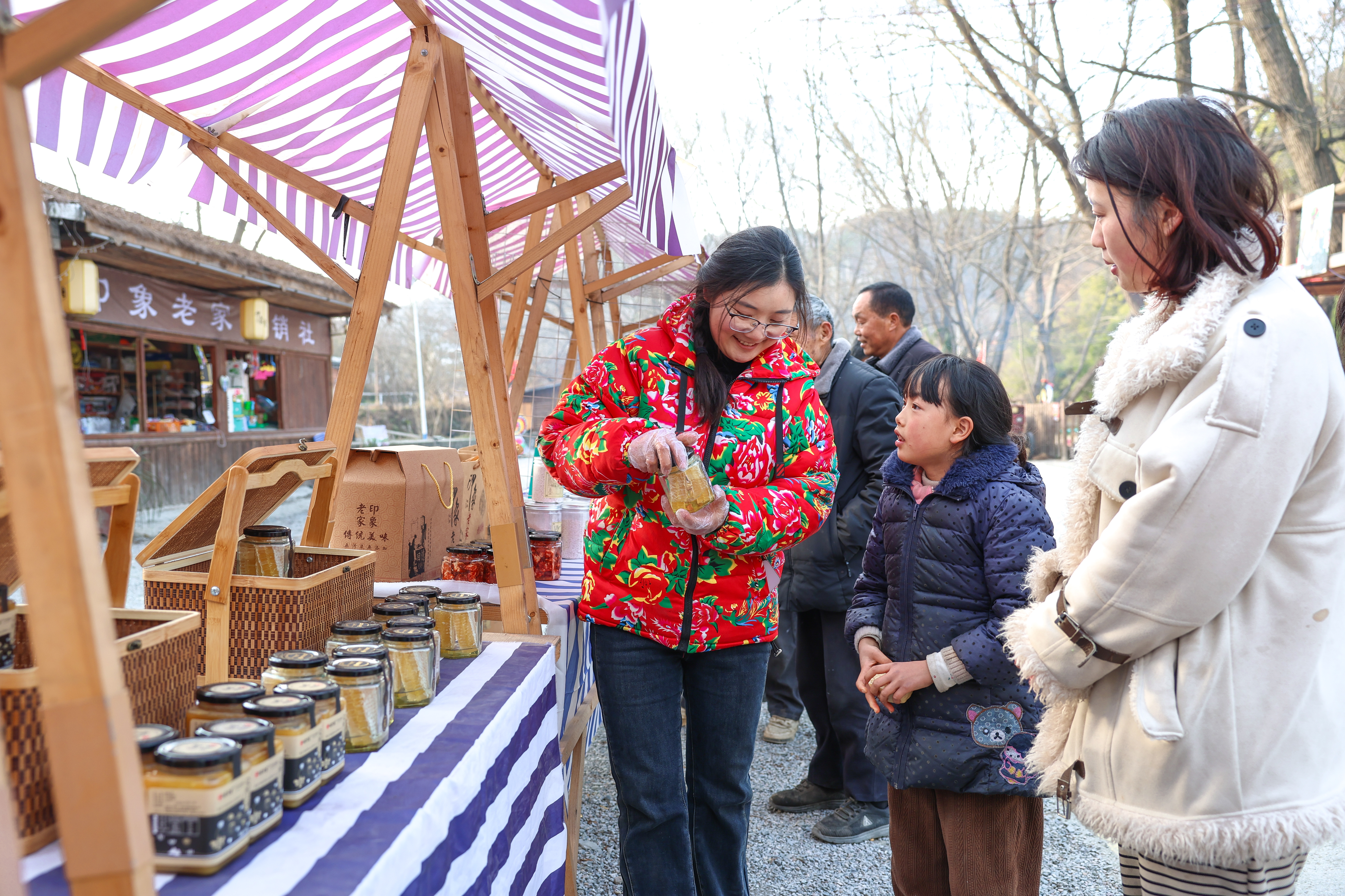 1月15日,湖北省襄阳市南漳县肖堰镇印象老家乡村旅游度假区举办年货节,展示推销当地农产品。(杨东摄)