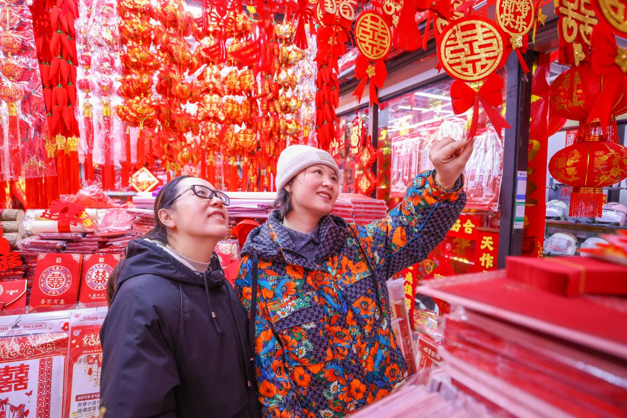 “自己挑,自己选,自己拿!”襄阳国际商贸城商户刘国昭在春联摊旁一边吆喝,一边为顾客包装年货。糖酒副食、进口商品、服装服饰、家居用品、年庆用品等年货应有尽有,市民在这里可以一站购齐。商贩的吆喝声、人们的询价声,交织成一首欢喜过大年的乐曲。