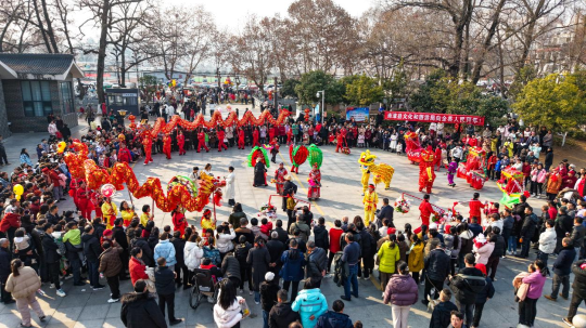 “咚咚锵……咚咚锵……”随着欢快的锣鼓声响起,舞狮表演团队率先登场。只见引狮者手握绣球,引导狮子做出各种动作,时而扑跃,时而翻滚,惟妙惟肖的表演赢得了观众阵阵掌声。紧接着,舞龙表演者们身着华丽服饰,手持五彩斑斓的龙身,在舞台上翻腾跳跃,气势磅礴。更有花棍、旱船、扭秧歌等多种民俗节目轮番上阵,演员们卖力表演,与观众近距离互动,每到精彩之处,大家纷纷掏出手机拍照记录。