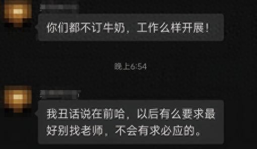 据网友提供的截图,浠水县实验小学一教师在班群内称,“还有哪些人没订奶,请在今天内完成。”三位家长接连表示,“今年不订牛奶了。”该教师表示,“你们都不订奶,工作怎么样展开”,并称“丑话说在前,以后有什么要求最好别找老师,不会有求必应的。”