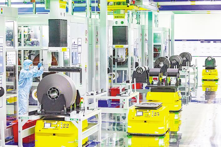 楚能新能源股份有限公司孝感锂电池产业园生产车间里,机器人忙着搬运材料。(湖北日报全媒记者倪娜摄)