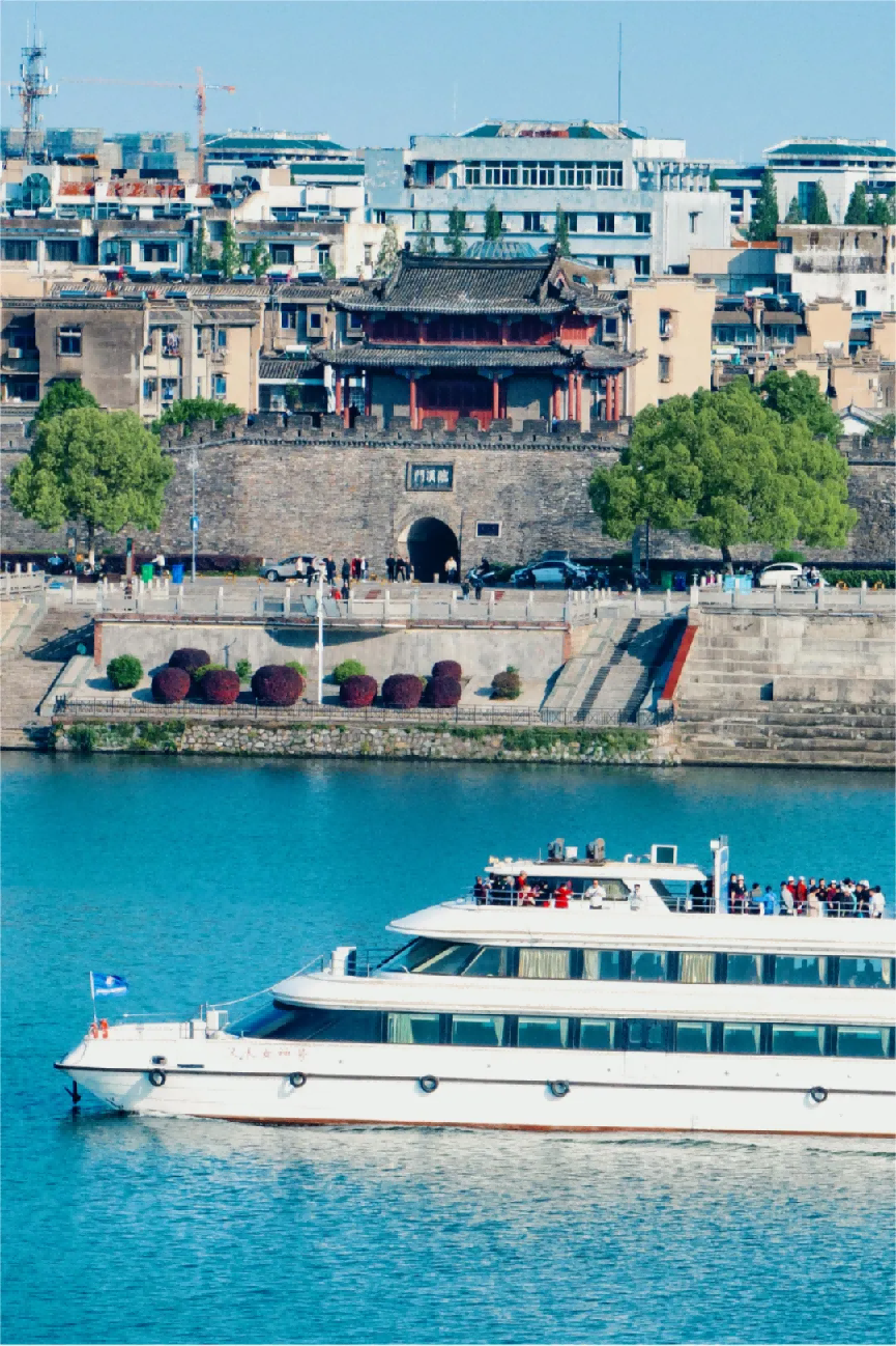 游客乘坐游船眺望襄阳古城。(视界网杨东摄)