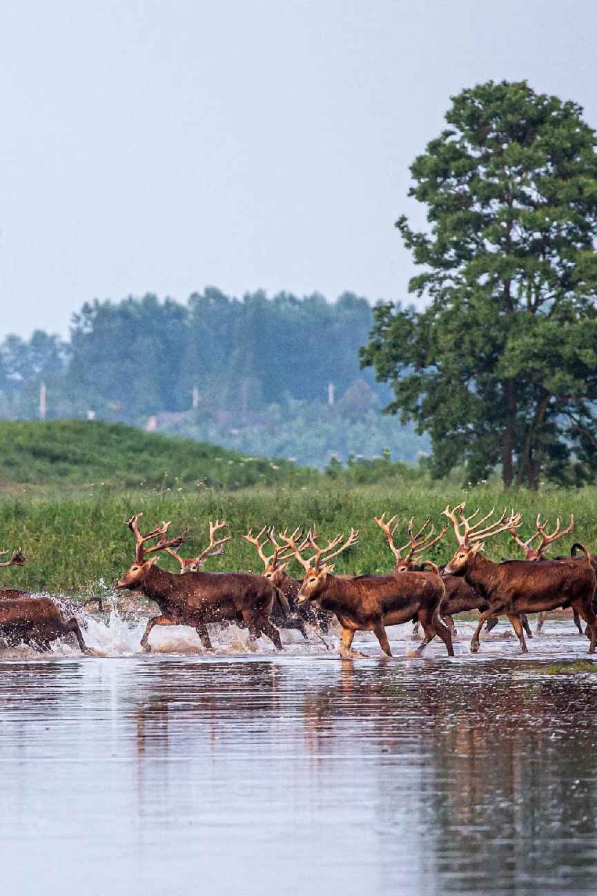 麋鹿大家庭在长江故道石首天鹅洲滩涂上嬉戏追逐,一派和谐的生态画卷。(湖北日报全媒记者梅涛摄)