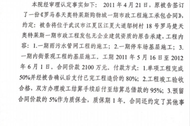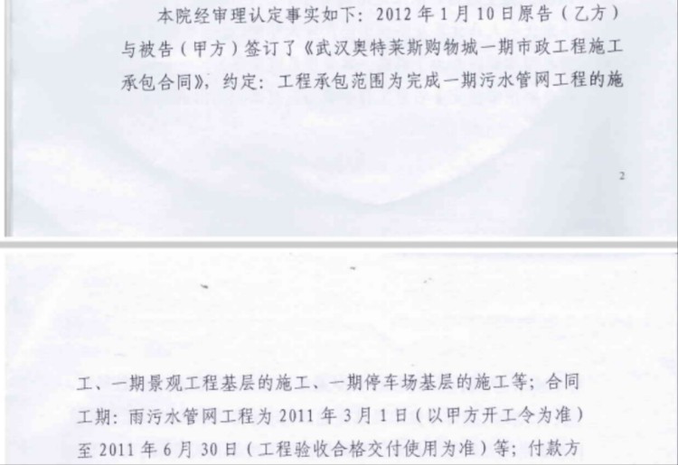 2019年4月2日,武汉市江夏区法院做出了“民初1506”号判决书,法官还是熊某某,书记员仍是汪某。判决书记载,经审理认定:2011年4月21日,原告武汉市楚才市政工程有限公司(下称楚才公司)与被告签订了《罗马春天奥特莱斯购物城一期市政工程施工承包合同》,约定,奥特莱斯将一期市政工程发包给楚才公司承建,工程内容为一期污水管网工程的施工;一期停车场基层施工;一期内街景观工程的施工等。总工程款为2300万余元,尚差欠2150万元。判决奥特莱斯公司10日内支付2150万元及利息。该案为缺席审判。