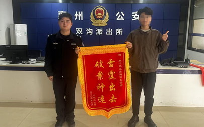 3月29日上午,市民刘先生赶到襄阳市襄州区公安局双沟派出所,将一面写有“雷霆出击破案神速”的锦旗送到民警手中,向帮助他追回被骗款的民警表达感谢。