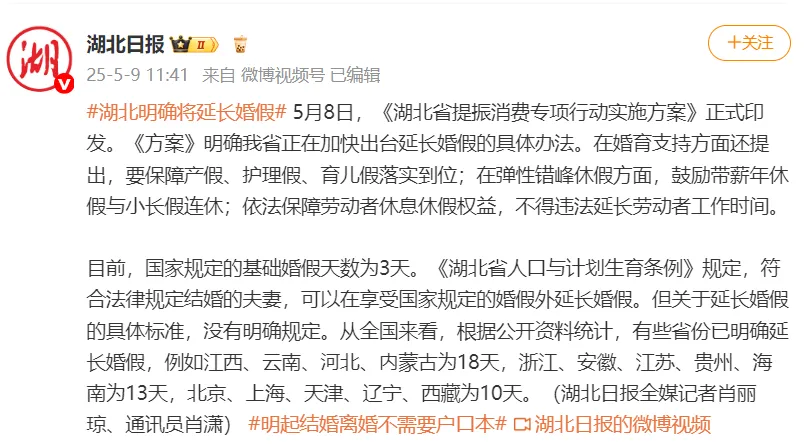 《方案》透露,湖北省正在加快出台延长婚假的具体办法。