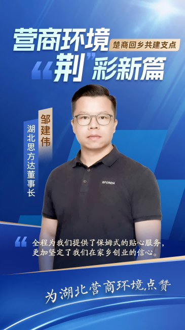 “一事一议”的灵活政策和职能部门“店小二”式的贴心服务,让邹建伟深切感受到家乡营商环境的优化。“回到家乡再次创业,无论是项目落地还是日常运营,宜昌市伍家岗区全程为我们提供了保姆式的贴心服务,这种实实在在的支持,让我打心底里觉得温暖、踏实,也让我找到了久违的归属感,更加坚定了在家乡创业的信心。”他说。在各种交流会上,他也自觉充当起家乡的宣传员,以吸引更多在外有志青年回到宜昌、留在宜昌、建设宜昌。