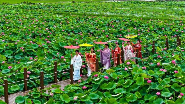 6月2日,游客身着古典服饰在宜城市郑集镇魏岗村荷花园内游玩