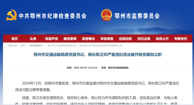 据鄂州市纪委监委网站消息:2024年12月,经鄂州市委批准,鄂州市纪委监委对鄂州市交通运输局原党组书记、局长陈卫兵严重违纪违法问题立案审查调查。