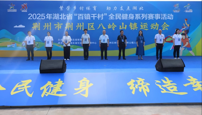 红绸翻飞,扁担吱呀……6月6日的荆州市荆州区八岭山镇杨场社区广场上,2025年湖北省“百镇千村”全民健身系列赛事活动第三站在此上演,一场场别开生面、充满乡土气息的“乡味奥运会”火热开场。系列活动涵盖1场乡镇运动会、1场环村健康跑、3场冠军校园行、1场体测惠万家,共吸引了八岭山镇村居民2000余人参加活动。