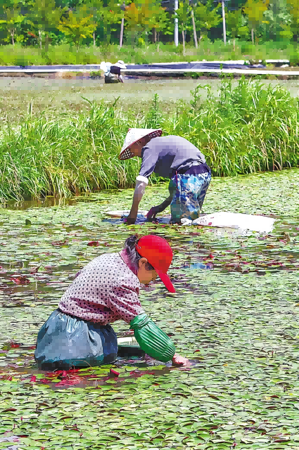 “今年收购价格6.5元/斤,5月份以来,7亩莼菜田已采摘了3300多斤,收入2万多元。”王碧秀介绍,她种植莼菜已有10多年,近几年产量和价格涨势稳定。今年亩产预计超过2000斤,大约可挣10万元。