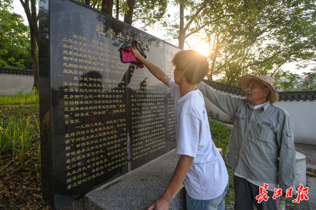 5月25日,小孙子陈世博在陈金国的带领下擦拭烈士纪念碑。