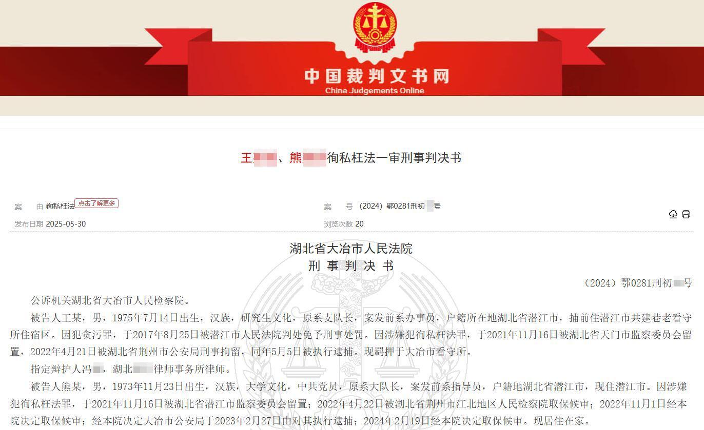 记者通过裁判文书网了解到,2024年8月,湖北省大冶市人民法院作出一审判决,王某、熊某因犯徇私枉法罪,分别被判处有期徒刑三年、有期徒刑一年五个月,二人违法所得被予以追缴,上缴国库;肖某被另案处理。