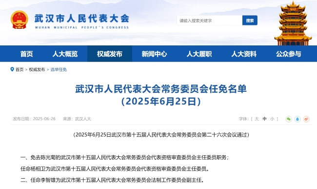 二、任命李智雄为武汉市第十五届人民代表大会常务委员会法制工作委员会副主任。