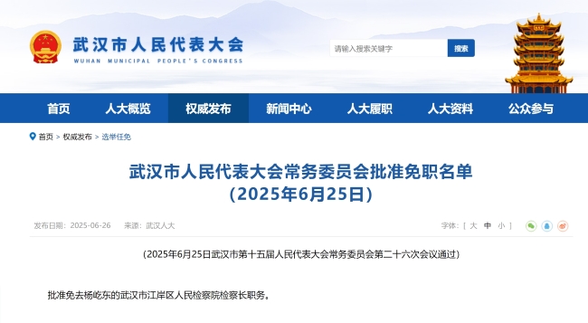 批准免去杨屹东的武汉市江岸区人民检察院检察长职务。