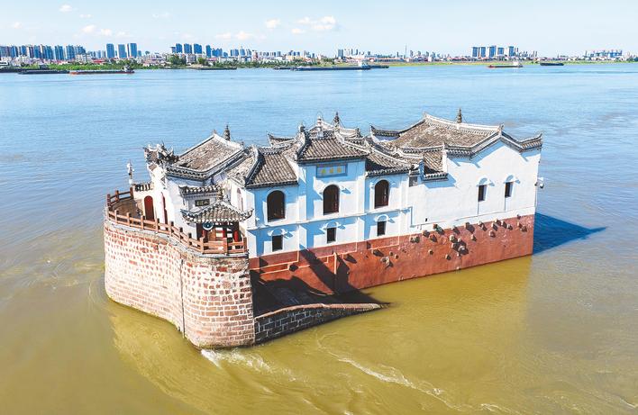 7月3日,长江鄂州段水位达21.06米,鄂州观音阁挡水墙基座被淹。有“万里长江第一阁”之称的鄂州观音阁,屹立长江近700年不倒。观音阁坐东朝西,阁西南迎水面有弧形石墙,能减缓水势,泄流防洪,内部还设排洪孔道,它们可迅速排洪,保护主体结构,造就了今日“阁坚强”。(湖北日报全媒记者薛婷 周鹏摄)