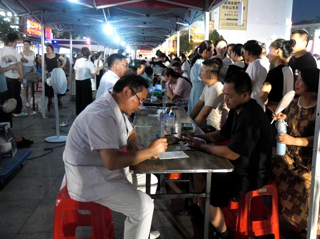在中医药健康集市,共设置体重管理体验区、体质辨识区、中医适宜技术体验区、中药材辨识区、中医养生区、“三伏贴”预约区和义诊区等7个区域,吸引着络绎不绝的市民。体质辨识区前,中医把脉问诊的队伍蜿蜒数十米;中药材辨识区里,孩子们通过“闻香识药”游戏认识当归、黄芪;三伏贴预约区更是火爆,医护人员耐心讲解冬病夏治原理,市民王女士当场预约:“我要带着全家来调理。”