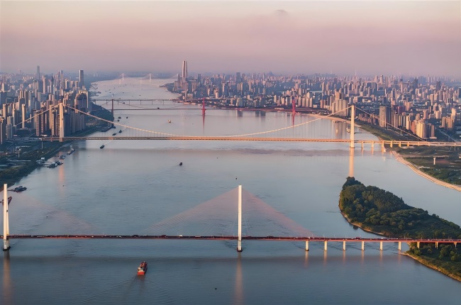 8月18日,武汉中心气象台又发布高温橙色预警,但武汉天空能见度很高,难得一见的通透性,一眼可望近30公里。当日傍晚,无人机在白沙洲长江大桥上游起飞,从500米高空鸟瞰武汉的长江大桥,八座长江大桥一图全收。(由近到远为:白沙洲长江大桥、杨泗港长江大桥、鹦鹉洲长江大桥、武汉长江大桥、武汉长江二桥、二七长江大桥、天兴洲长江大桥、青山长江大桥。)航拍视角带你一睹桥都——武汉的壮丽景象。(湖北日报全媒记者朱熙勇摄)