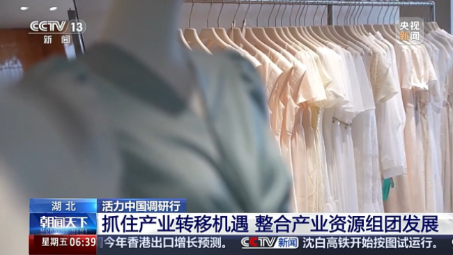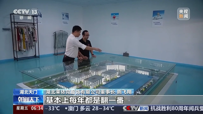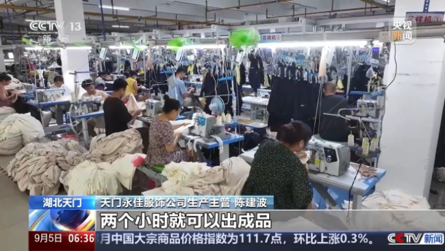 天门永佳服饰公司生产主管陈建波:以前1000件衣服生产出来可能要两三天,现在1000件衣服从早上挂片,两个小时就可以出成品。