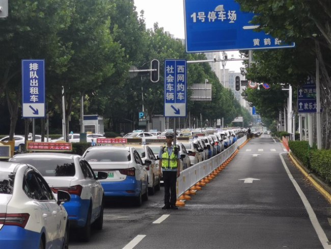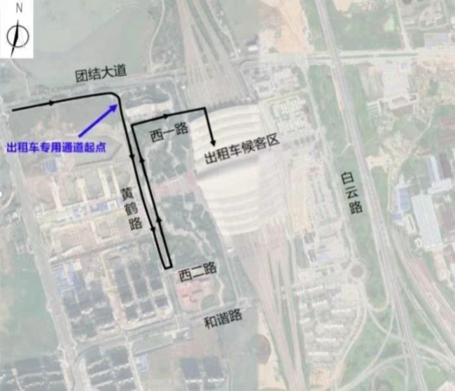 北出口出租车站点:黄鹤路车道格局从“2+2”改为“3+1”,3股车道设为出租车专用排队通道;站区四边形区域仅保留1条边供出租车停靠,释放2条道路通行空间,避免与社会车辆混行造成拥堵。