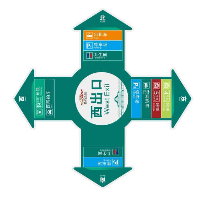 5.三条地铁线:明确各线路站点位置与通行方向——19号线位于西广场(至光谷方向)、4号线位于一楼核心区(至蔡甸方向)、5号线位于东广场(至红霞方向),通过清晰引导让旅客快速定位,减少站内绕行时间。