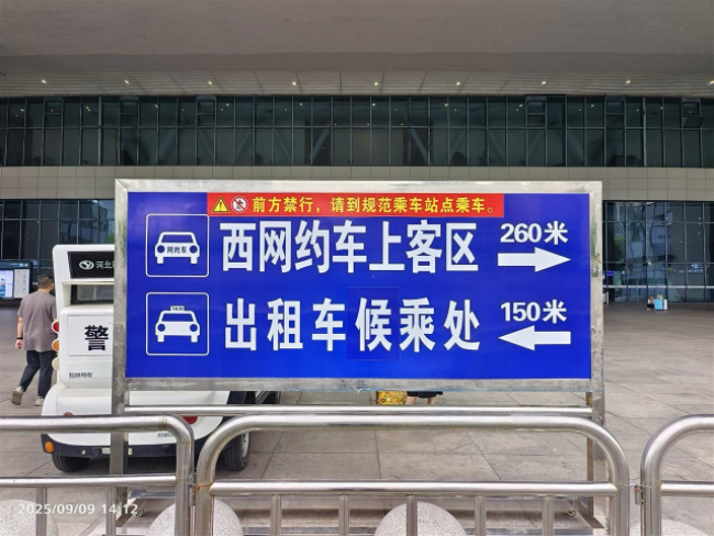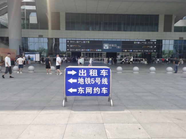 为了让旅客高效衔接交通工具,武汉站地区综管办在东、西出口设置醒目标识,清晰标注网约车、出租车、地铁的乘车方向。